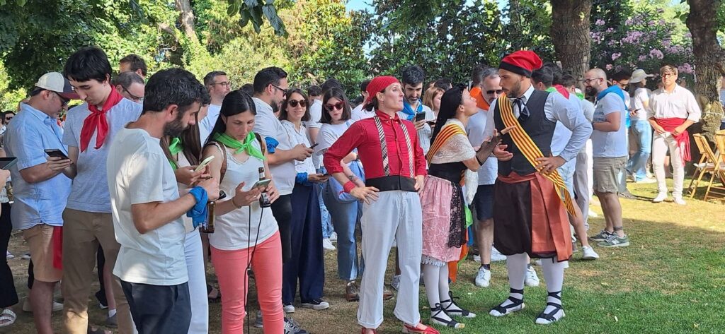 🎭 La bienvenida la dieron cuatro personajes teatrales típicos catalanes —barretina, faja y una sonrisa permanente— que recibieron al grupo con humor, cercanía y guiños a las raíces culturales del territorio.